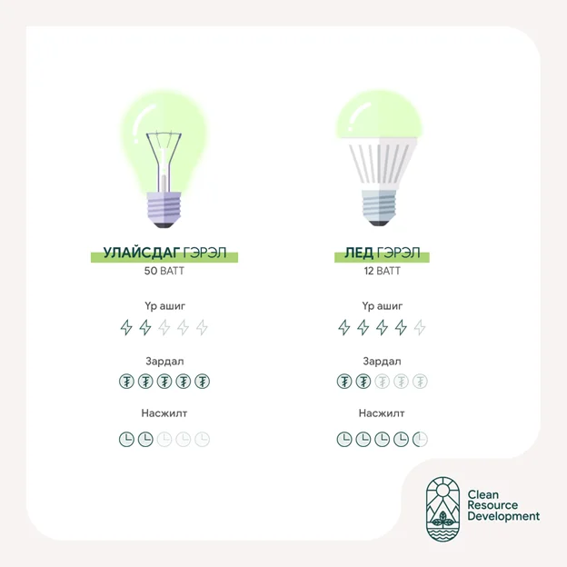 Цахилгаан хэрэгсэл ашиглахдаа эрчим хүч, сарын төлбөрийг хэмнэх хамгийн хялбар аргаас эхэлцгээе. Манай улсад нийтлэг хэрэглэгддэг улайсдаг гэрлийн чийдэн нь 50-60 ватт орчим эрчим хүчний өндөр зарцуулалттай, хэрэглээний нас нь бага бөгөөд халаах явцад дулаан ялгаруулдаг Т.Эдисоны 1879 оны патентын анхны хувилбар хэвээр байна.